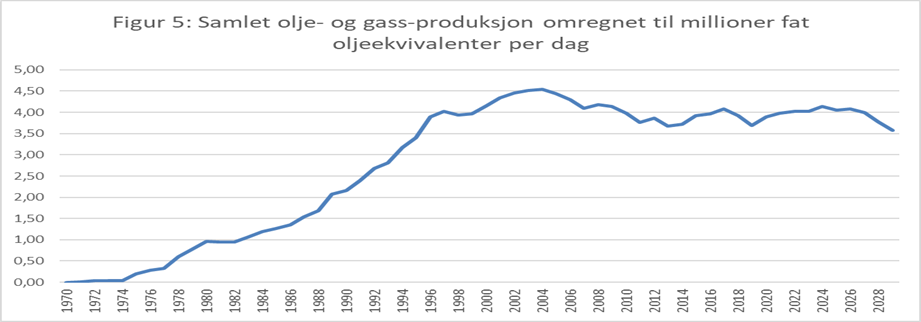 Bruken av oljepenger vil i hovedsak påvirke utnyttingen av den til enhver tid gitte produksjonskapasitet, men i mindre grad selve mulighetsrommet. Våre rike tilganger på midler, bidrar sikkert til at mangt og meget i samfunnet er mindre effektivt enn i fattigere land. Men det gir ikke store utslag i norsk økonomis langsiktige vekstevne. Figur 5 gir en bestegjetning på hvor mye produksjon av olje og gass vi kan vente oss resten av dette tiåret.