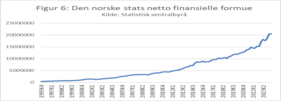 Men den gang var vi unge, med stor utenlandsgjeld og en umoden finanssektor. Nå har vi blitt et aldrende, rikt samfunn med enorme fondsavsetninger i både privat og i offentlig sektor. Skal du øke konsum og investeringer her hjemme er det ikke lenger pengene det står på, men å få tak i fagfolk som kan gjøre jobben med å produsere godene. Figur 6 viser utviklingen i statens samlede netto finansielle fordringer: