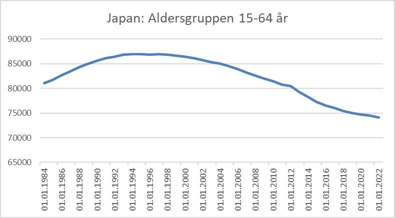 På slutten av 1980-tallet fryktet man at Japan kom til å overta mye av hegemoniet i verdens kapitalistiske system fra amerikanerne takket være sitt suksessrike næringsliv. Imidlertid begynte fødselstallene å svikte, med en tiltakende nedgang i befolkningen som resultat. Her vist i figuren: