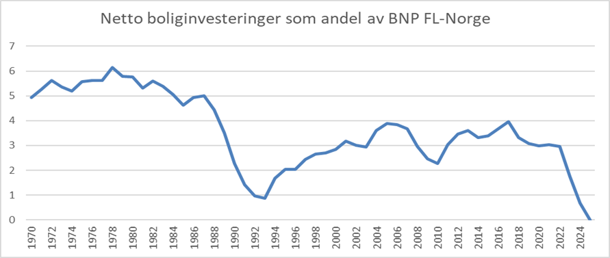 Reiulf Steen får i denne serien et ufortjent dårlig skussmål, da han på denne tid var forkjemper for noe av det viktigste i samfunnet: Boligbygging. Den gang, da han hadde en finger på rattet, var boliginvesteringene netto (;etter at kapitalslitet er trukket ifra), om lag 5 prosent av BNP. Politikerne prioriterte behovene for å bo godt så høyt at omtale av boligbyggingen utgjorde første avsnitt av Nasjonalbudsjettet. Men som vi ser av figuren ble det sterk nedgang i boliginvesteringene som andel av BNP etter at bolig- og kredittmarkedene ble liberalisert.