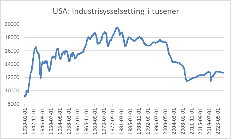 Industrisysselsettingen toppet i 1979. Og falt først tilbake med Ronald Reagans sterke dollar. Trump erfarer nå det samme som Nixon gjorde: tariffer skader industrisysselsettingen. Siden tollene ble erklært i april i fjor, på den såkalte Independence Day, har ikke sysselsettingen i amerikanske industri gjort noe annet enn å falle. Det taler for at han før eller siden også blir mer glad i å bruke valutakursen som våpen.