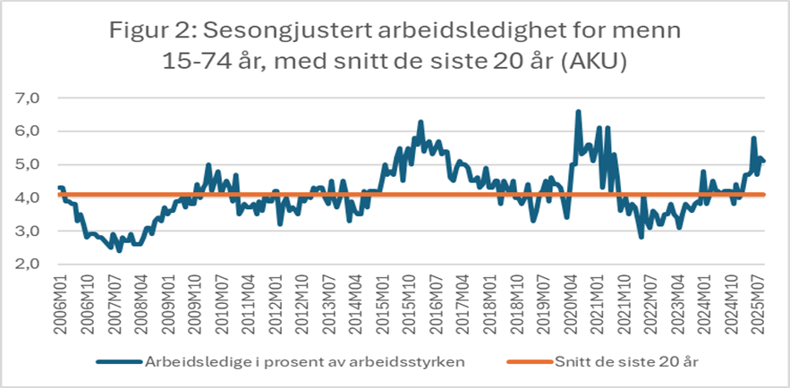 Selv foretrekker jeg å bruke Arbeidskraftsundersøkelsen (AKU) fra Statistisk sentralbyrå som er en telefonbasert spørreundersøkelse i befolkningen. Denne viser langt verre tall, og en skremmende utvikling i ledigheten for menn.
